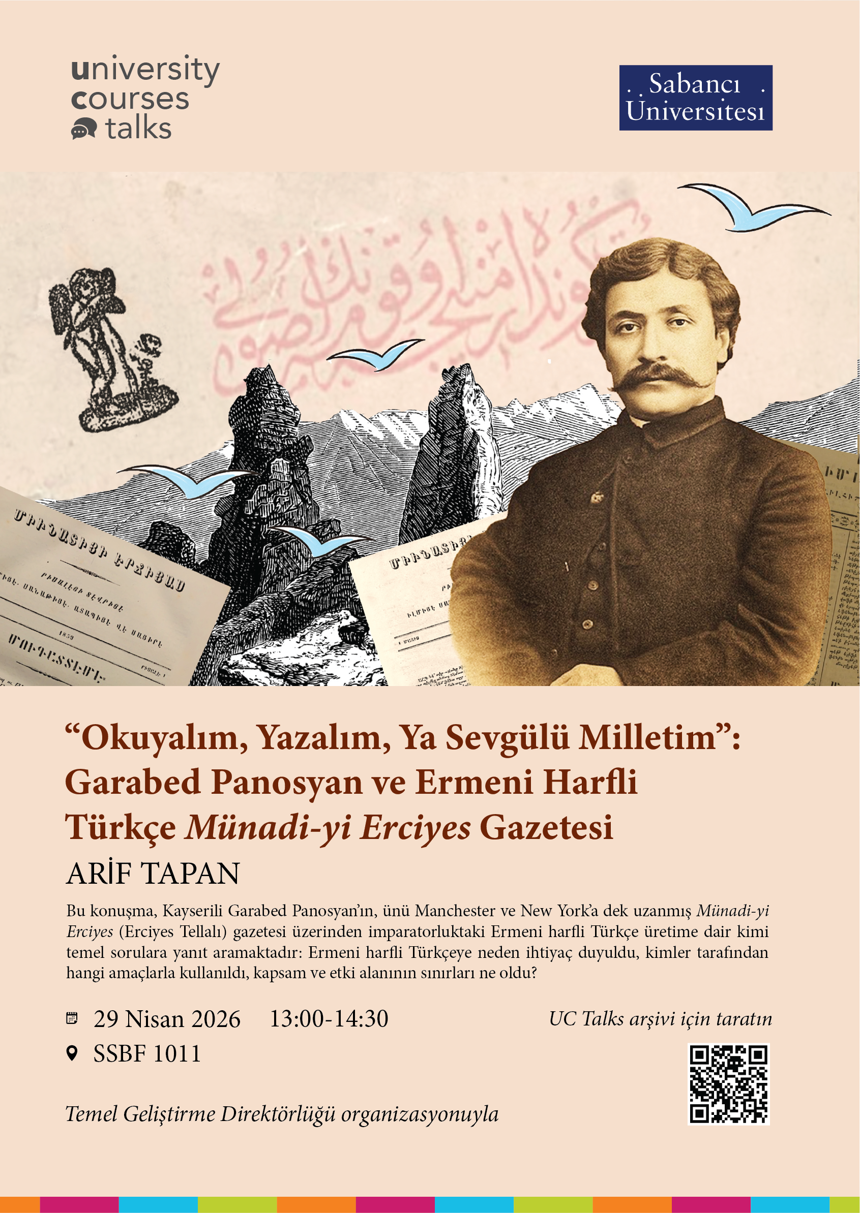 29 Nisan 2026, Çarşamba günü 13:00 - 14:30 saatleri arasında SSBF (FASS) 1011'de yapılacak olan "Okuyalım, Yazalım, Ya Sevgülü Milletim: Garabed Panosyan ve Ermeni Harfli Türkçe Münadi-yi Erciyes Gazetesi" başlıklı UCTalks oturumuna davetlisiniz.