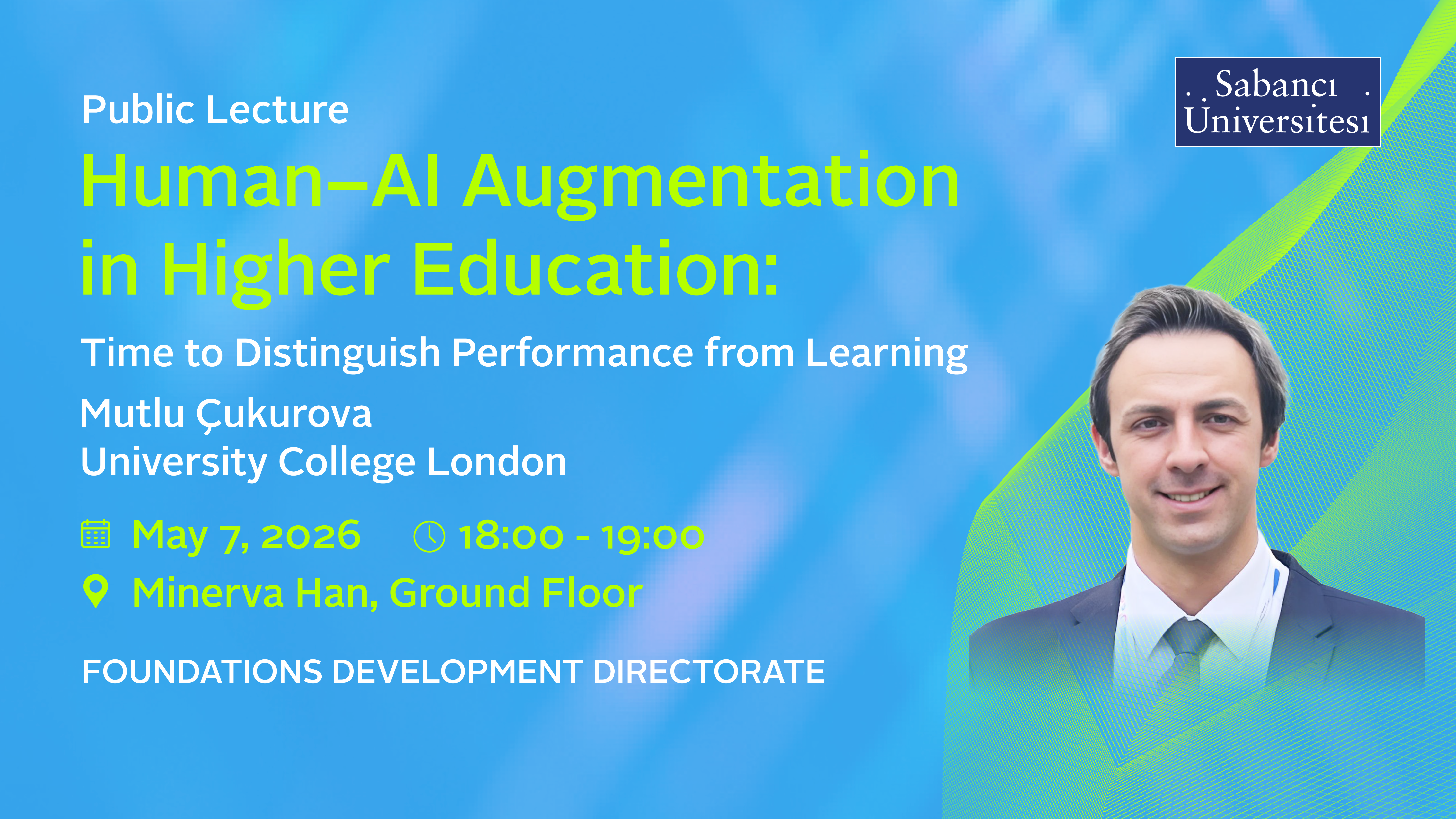 You are cordially invited to the public lecture titled "Human-AI Augmentation in Higher Education: Time to Distinguish Performance from Learning"with Mutlu Çukurova, Professor of Learning and Artificial Intelligence at University College London.