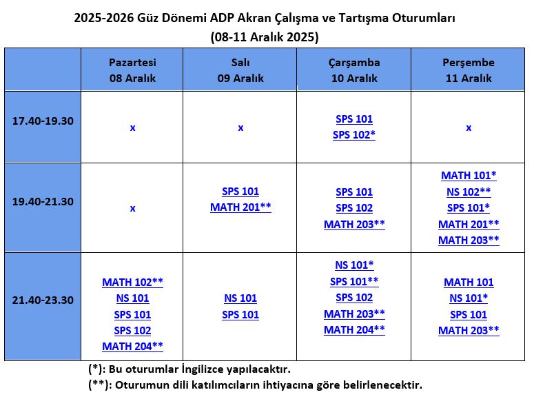 Akademik Destek Programı (ADP/ASP), öğrenme sürecini daha zevkli kılacak, çalışma veriminizi ve başarınızı arttırmaya yönelik oturumlar düzenler. Bu oturumlar, akran dayanışması prensibine dayanır ve eleştirel düşünme, iletişim ve çalışma becerilerinizi geliştirmeyi amaçlar. MATH 101, MATH 102, MATH 201, MATH 203, MATH 204, NS 101, NS 102, SPS 101 ve SPS 102 derslerindeki akademik başarınızı arttırmak için oturumlarımıza katılabilirsiniz.